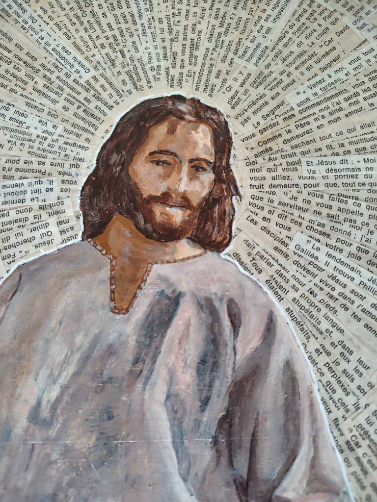 JESUS Titre : « JESUS » commande privée Dimension : 42X32 cm Technique : Posca, Acrylique et Papiers découpés Support : Bois Date de réalisation : 2018 JESUS-42X32cm JESUS-Détail-42X32cm JESUS-Détail-42X32cm RETOUR