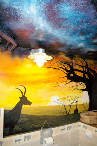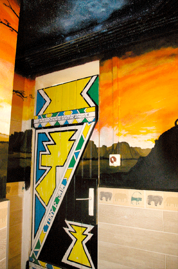 Chaque mur devient un fragment de paysage, pensé comme une scène narrative. La porte a également été peinte dans un style Ndebele, motifs graphiques et géométriques africain, ajoutant une touche de contraste et d’ancrage culturel.