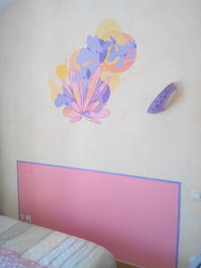 Réalisation d’une fresque murale décorative et d’une tête de lit, dans une chambre à l’ambiance douce et apaisante.