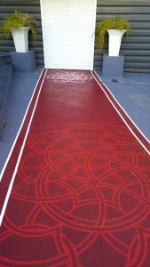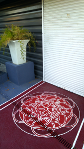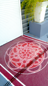 Réalisation d’une fresque décorative au sol de 80 m², conçue comme un tapis graphique contemporain à l’entrée du salon de coiffure Kamiros.