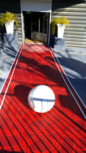 L’ensemble donne l’illusion d’un tapis d’accueil peint, qui guide le regard vers l’entrée et offre une identité forte et singulière à l’établissement.